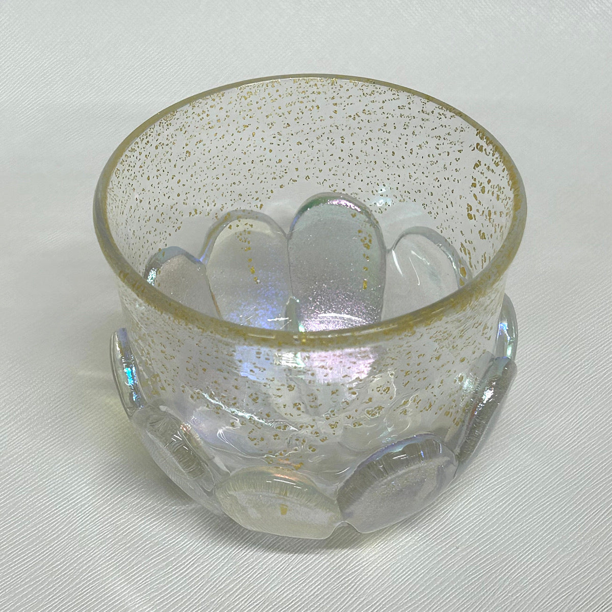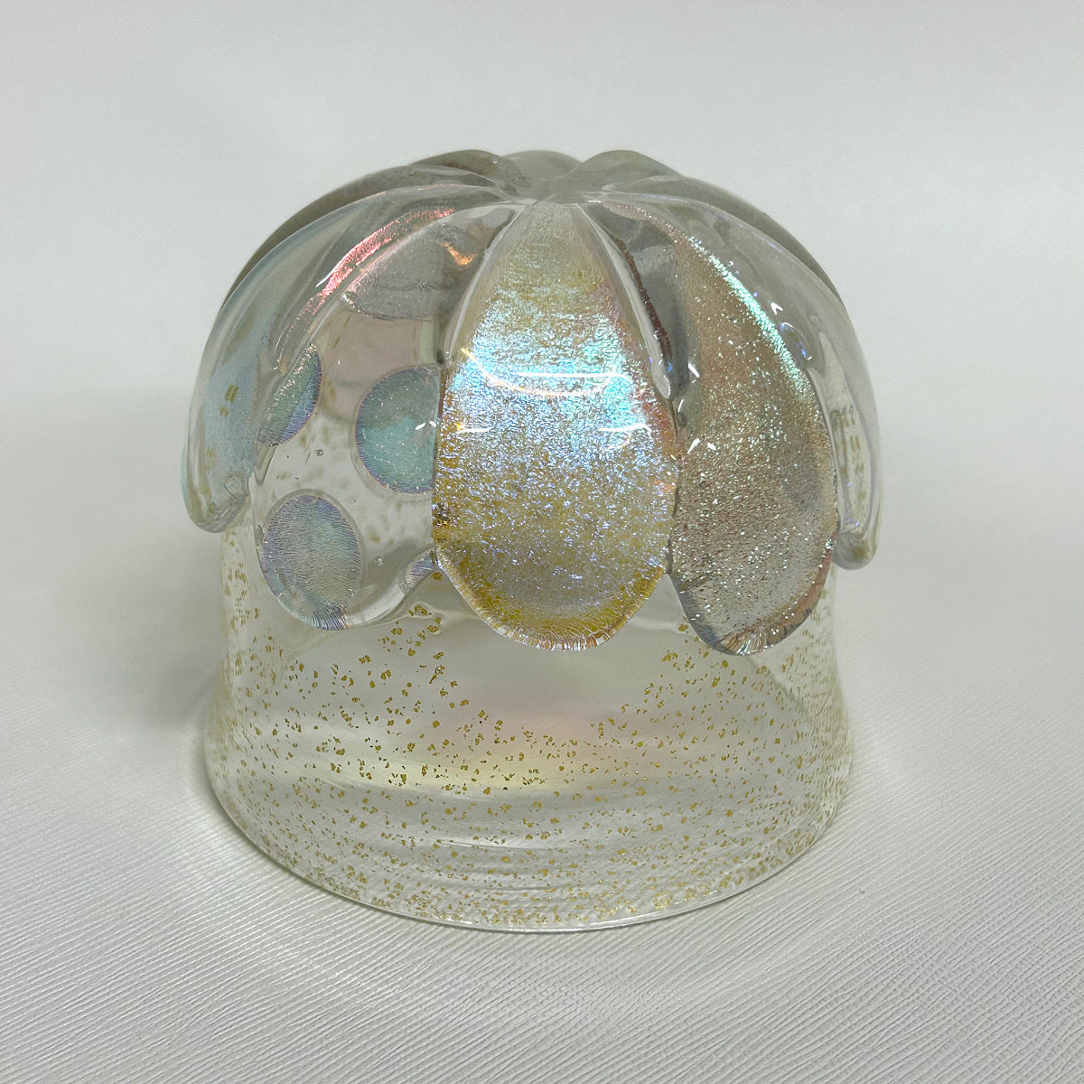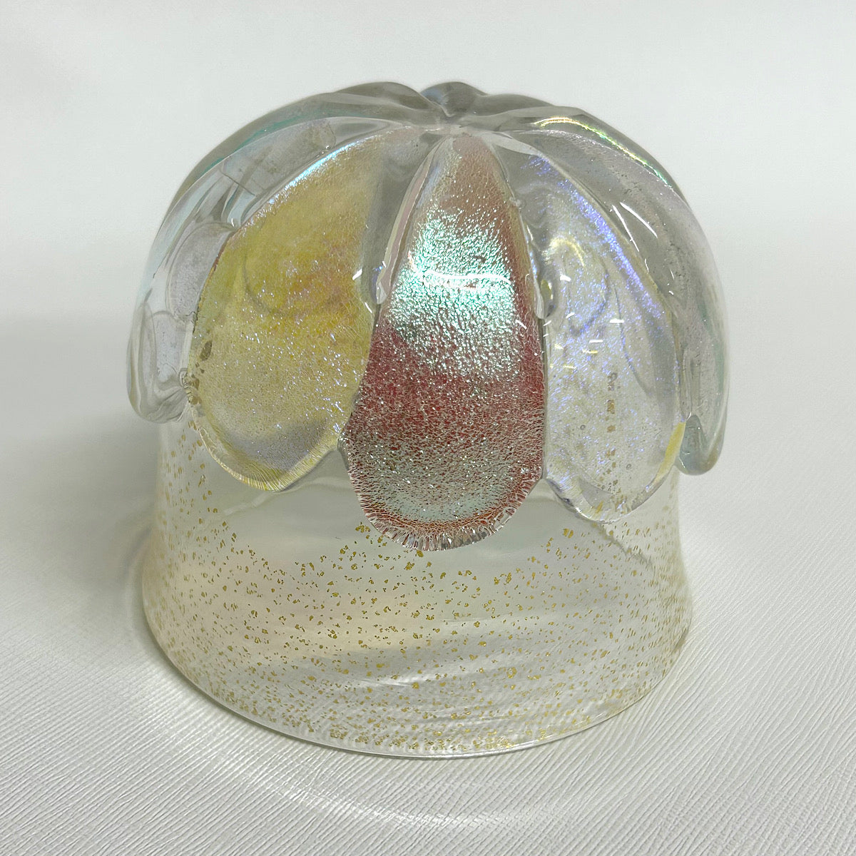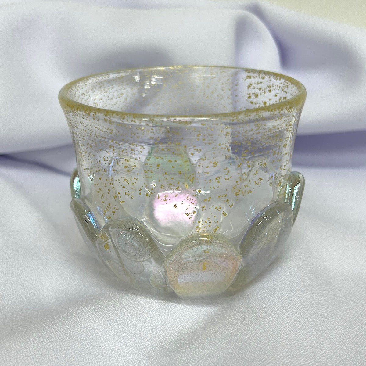 ガラス造形作家の June Yoda(依田 淳子)氏による、ダイクロガラス※ を使用して制作された幻想的で可愛らしい花柄グラス作品。