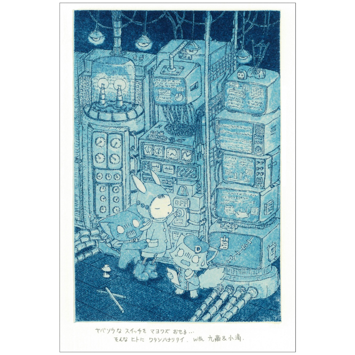 限定ポストカードのデザインは、発売後たちまち完売してしまったオリジナル銅版画作品「ヤバソウなスイッチをマヨワズおせる... そんなヒトにワタシハナリタイ with 九藏&小滴」です。