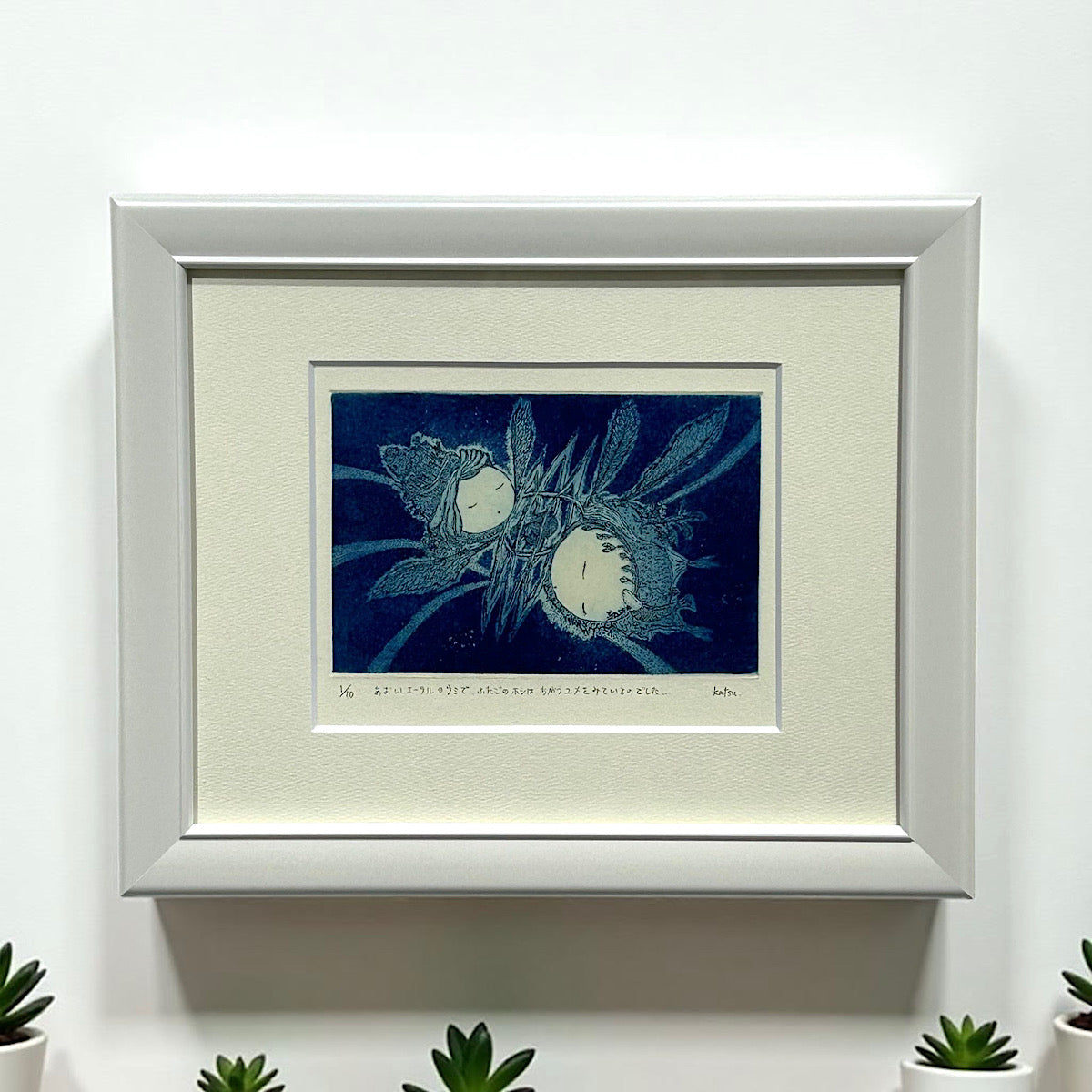 【オリジナル銅版画】前田 勝弘(Katsuhiro MAEDA)「あおいエーテルのウミで ふたごのホシは ちがうユメをみているのでした...」(ed. 1/10)