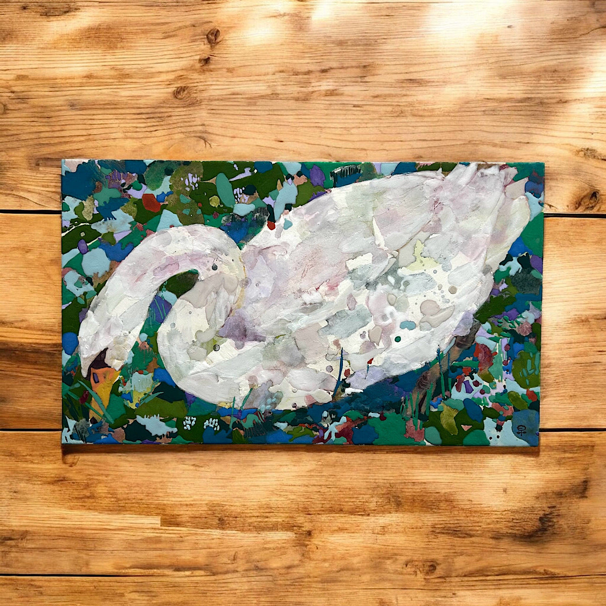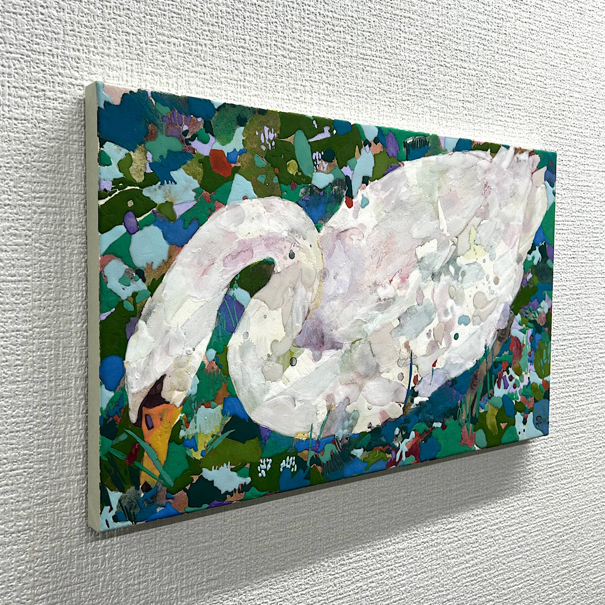 実力派の若手女流日本画アーティスト、藤原 早苗(Sanae FUJIWARA)氏による、食べ物をついばむ白鳥をモチーフとした色彩豊かな絵画作品!!