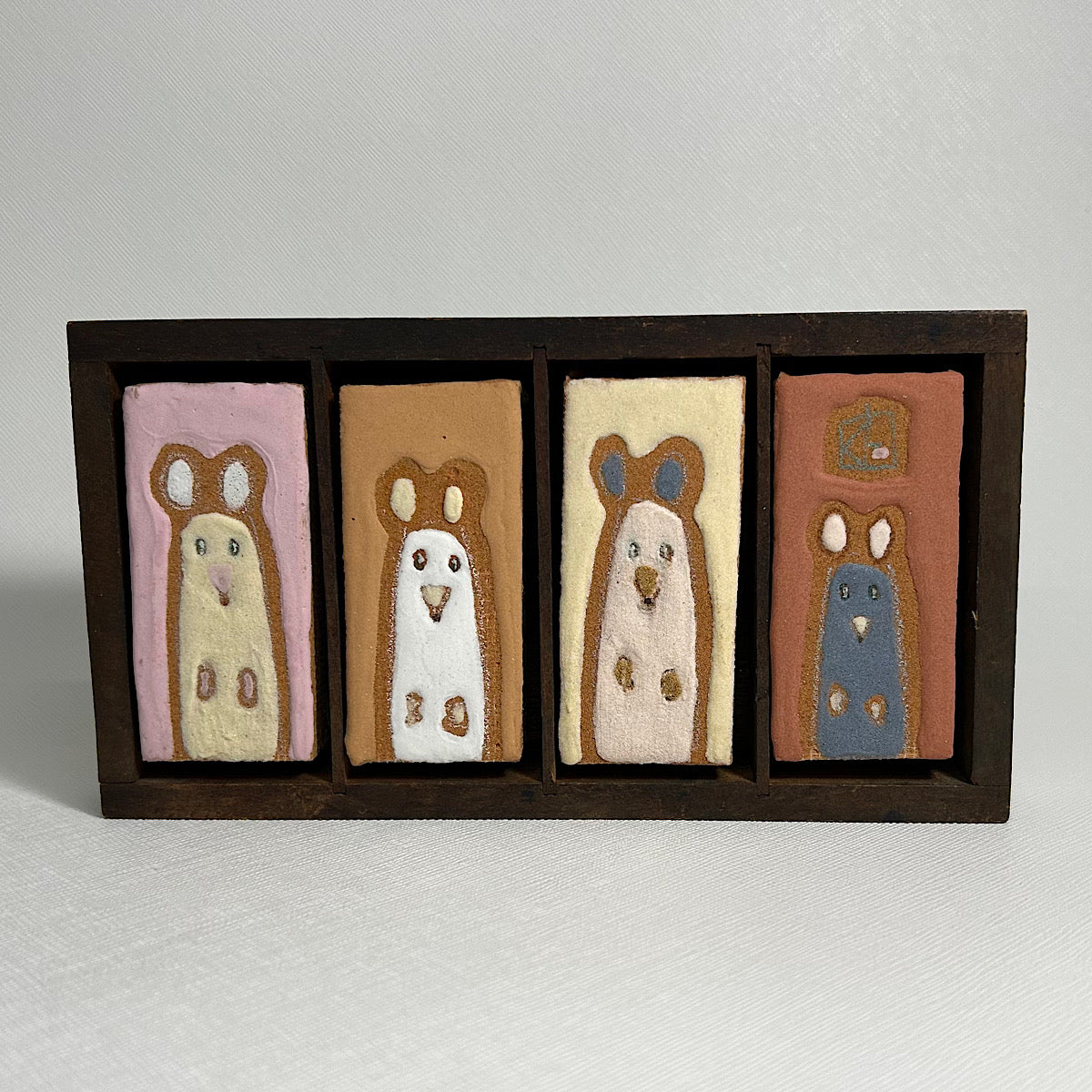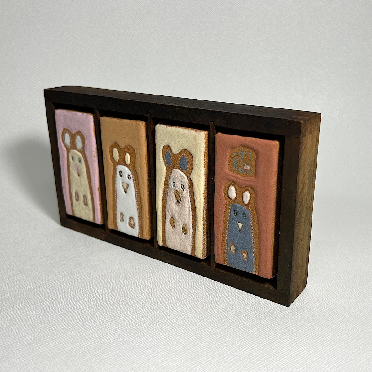 4匹の可愛らしいネズミの小さな絵画が並び、見ているだけで気分がほっこりとしてきそうです🎵