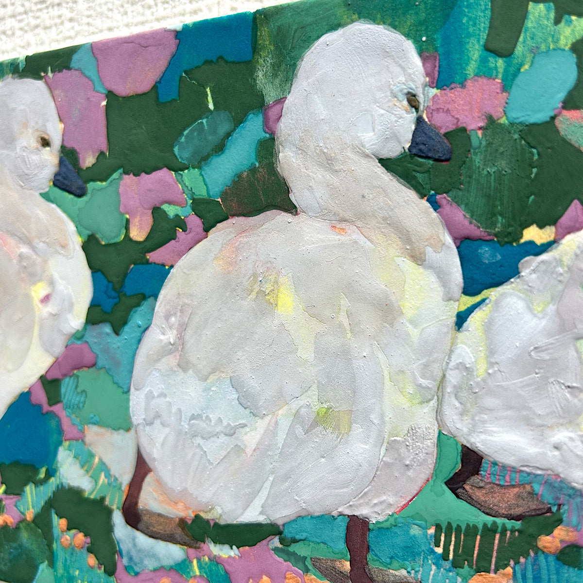 2羽の子供のアヒルが、置いていかれないように前のアヒルに必死についていく姿が、藤原氏ならではの明るく立体的な色彩で描かれております。